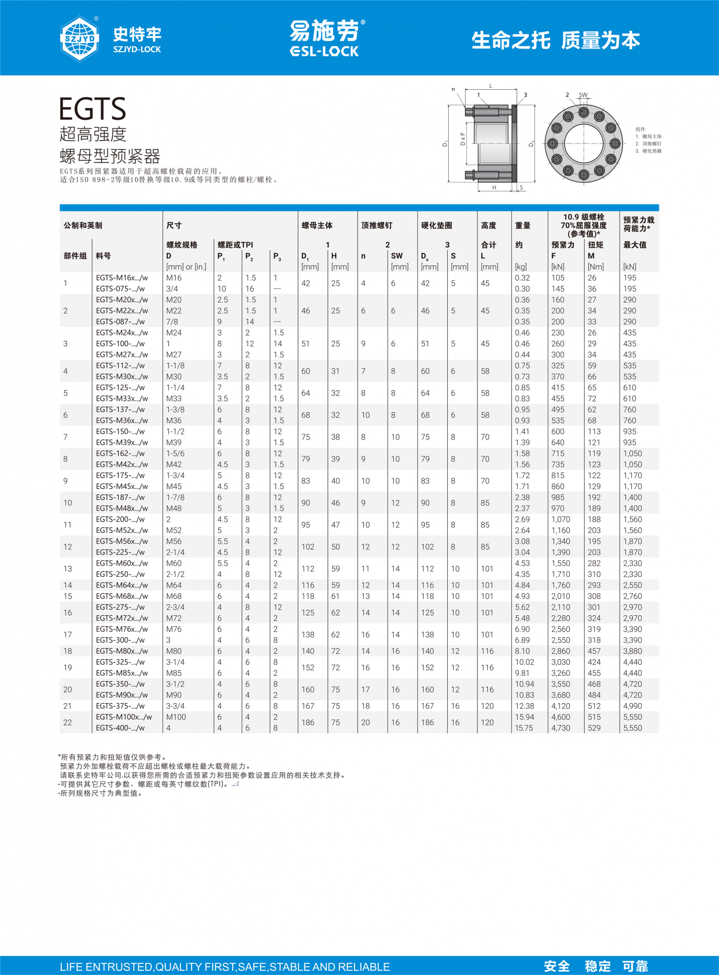 多頂推超級預(yù)緊器,可在很小空間安裝,使用簡單工具即可輕松預(yù)緊,節(jié)省安裝時間,ESL-LOCK品牌易施勞超級螺母具有完全的防松鎖緊功能,可多次拆卸重復(fù)使用。特別適用于M24規(guī)格以上大型螺栓鎖緊!一擰永固,永不松動!使用常規(guī)格為合金材料及特殊不銹鋼合金材料以及鎳基合金材料!更多了解歡迎咨詢我們.....