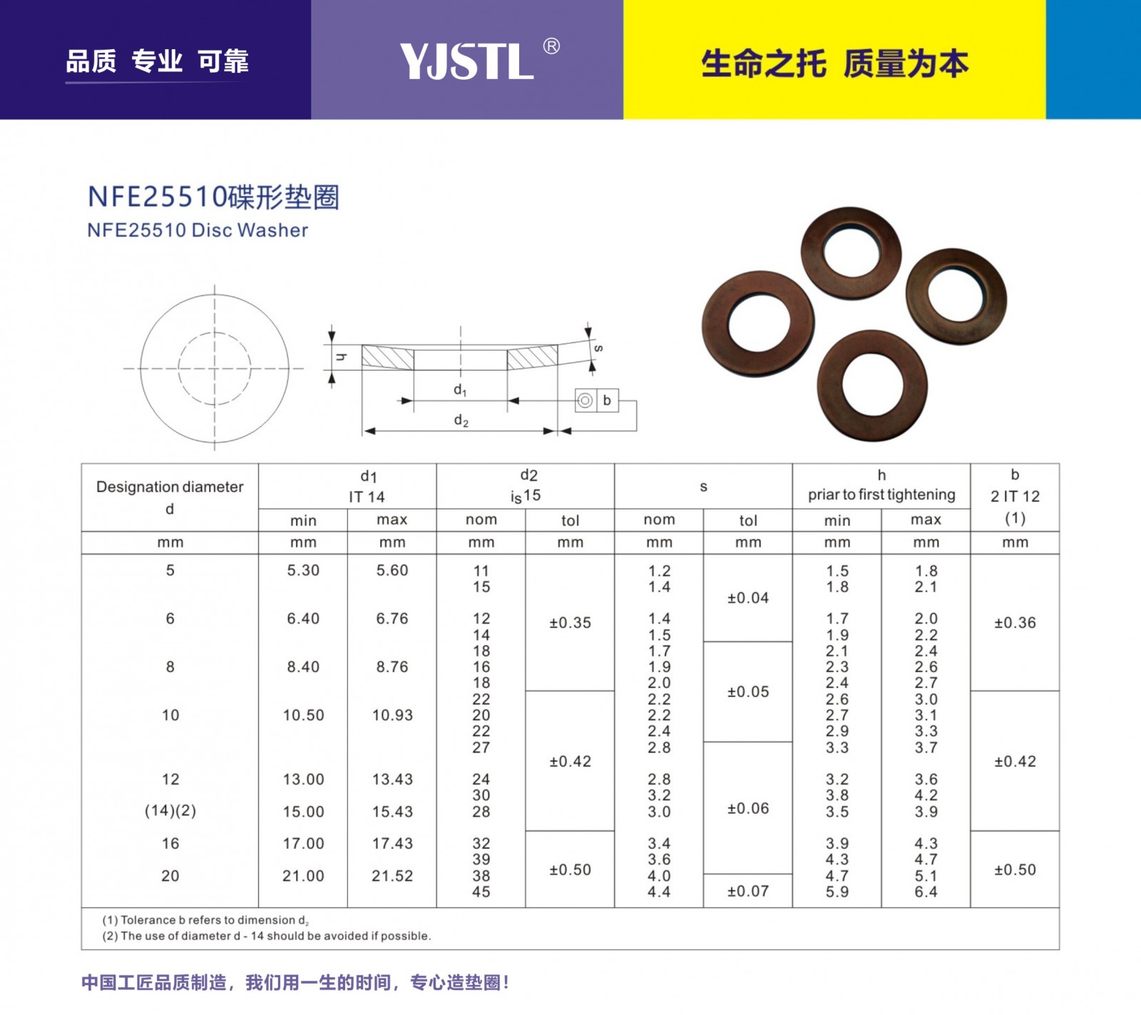 制造執(zhí)行標準:符合NFE25510與DIN6796-HS標準。規(guī)格:M5-M20型號,也可提供訂制服務主要材質有S60C,60Si2mn,51crav4及特殊合金材質,鹽浴硬化,表面處理為磷化黑,機械鋅,達克羅涂層等!不提供化學電鍍處理!多數(shù)情況下標準型碟形彈簧墊圈并不能完全滿足用戶要求,通過計算與適當調整來獲得理想的訂制功能!