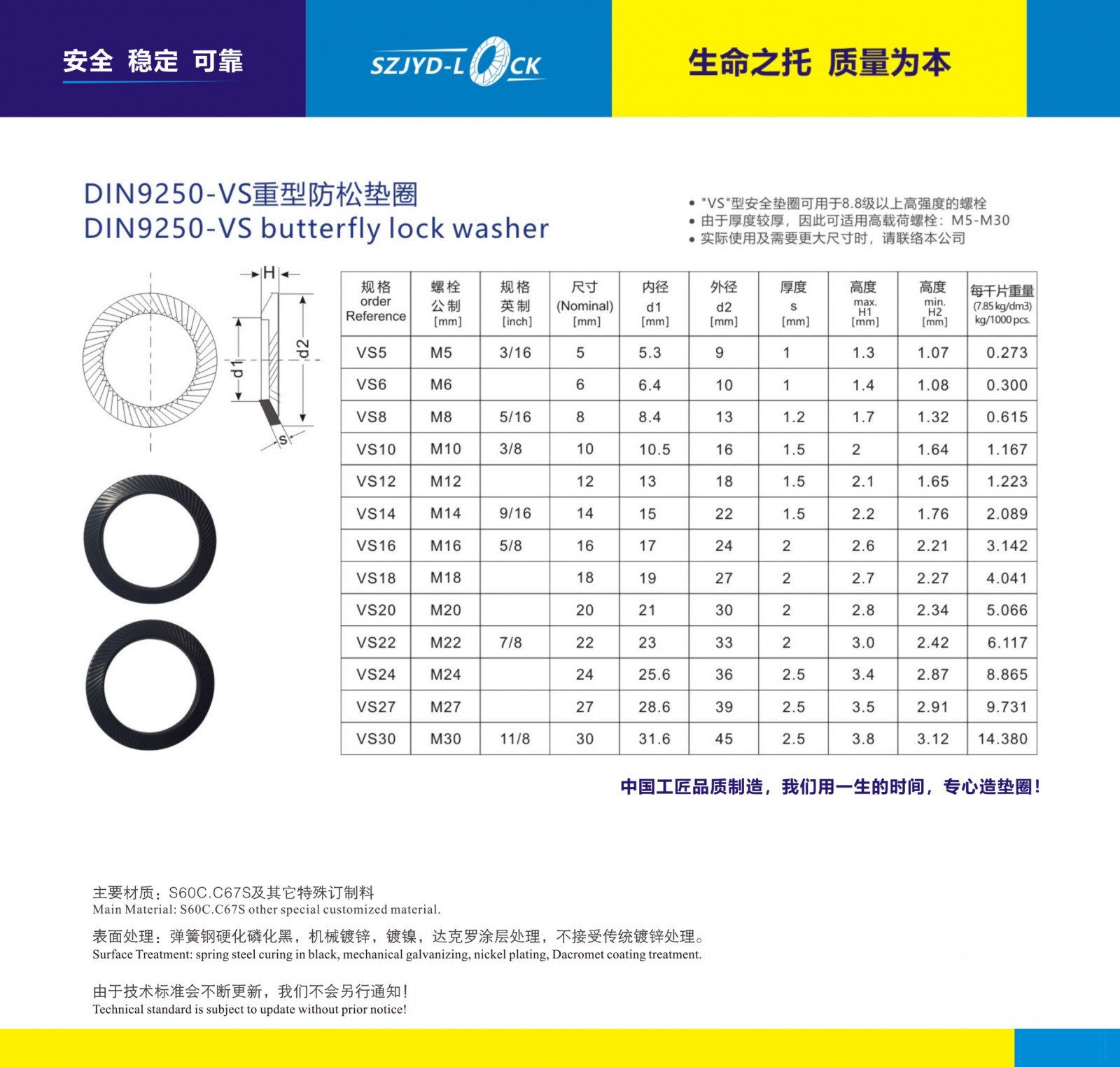 DIN9250防松墊圈、執(zhí)行德國標準、按螺栓的使用條件分為兩類:8.8級以下螺栓均選用S輕型安全防松墊圈、10.9級以上螺栓均先用VS重型安全墊圈系列、