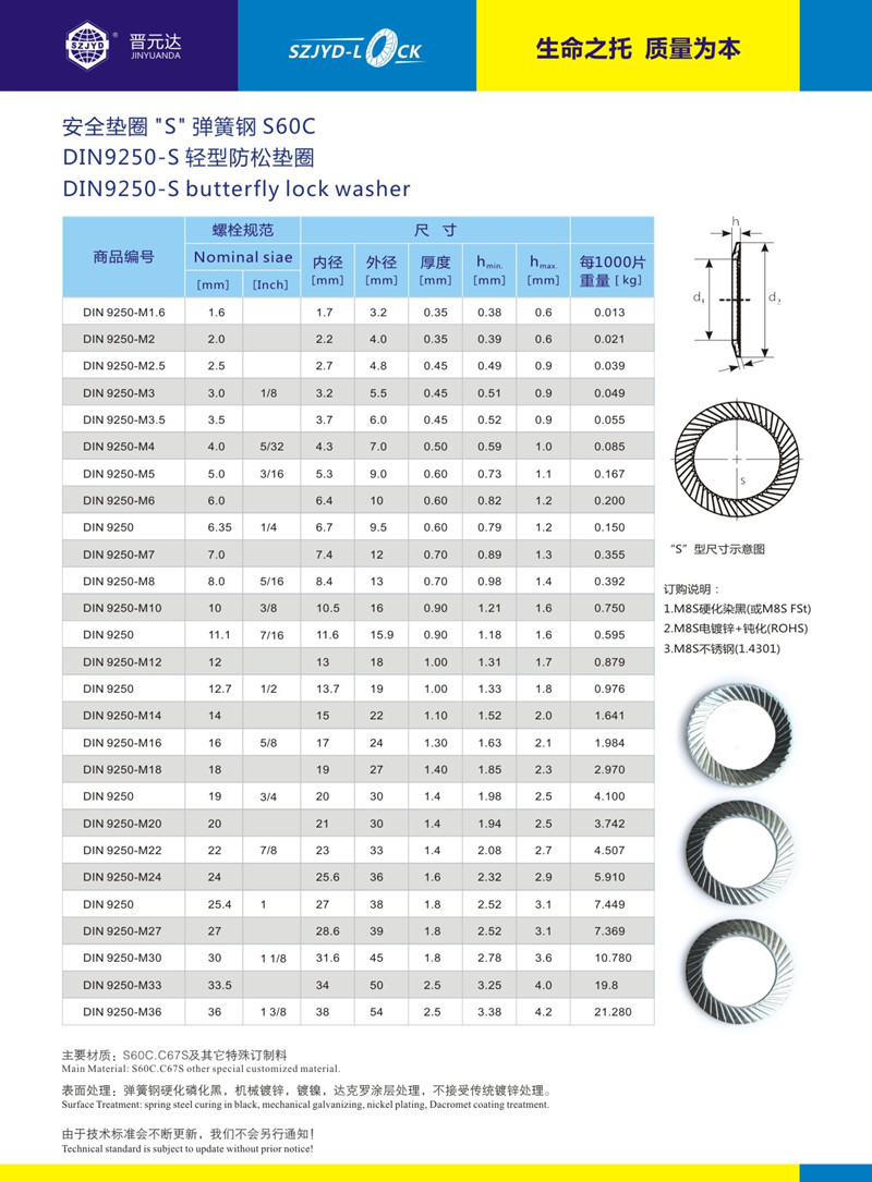 DIN9250防松墊圈、執(zhí)行德國標(biāo)準(zhǔn)、按螺栓的使用條件分為兩類:8.8級(jí)以下螺栓均選用S輕型安全防松墊圈、10.9級(jí)以上螺栓均先用VS重型安全墊圈系列、