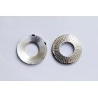 DIN6795是德國標(biāo)準(zhǔn)、該墊圈是一款法式鎖緊墊圈的改良設(shè)計產(chǎn)品、表面條紋有預(yù)緊防松作用。墊圈的背面設(shè)計有六個爪形剌破角!主要功能是在配合螺栓螺釘擰緊時可以剌破金屬基體表面!主要功能是剌破作用、因此也有人叫剌破墊圈、帶爪觸地墊圈!