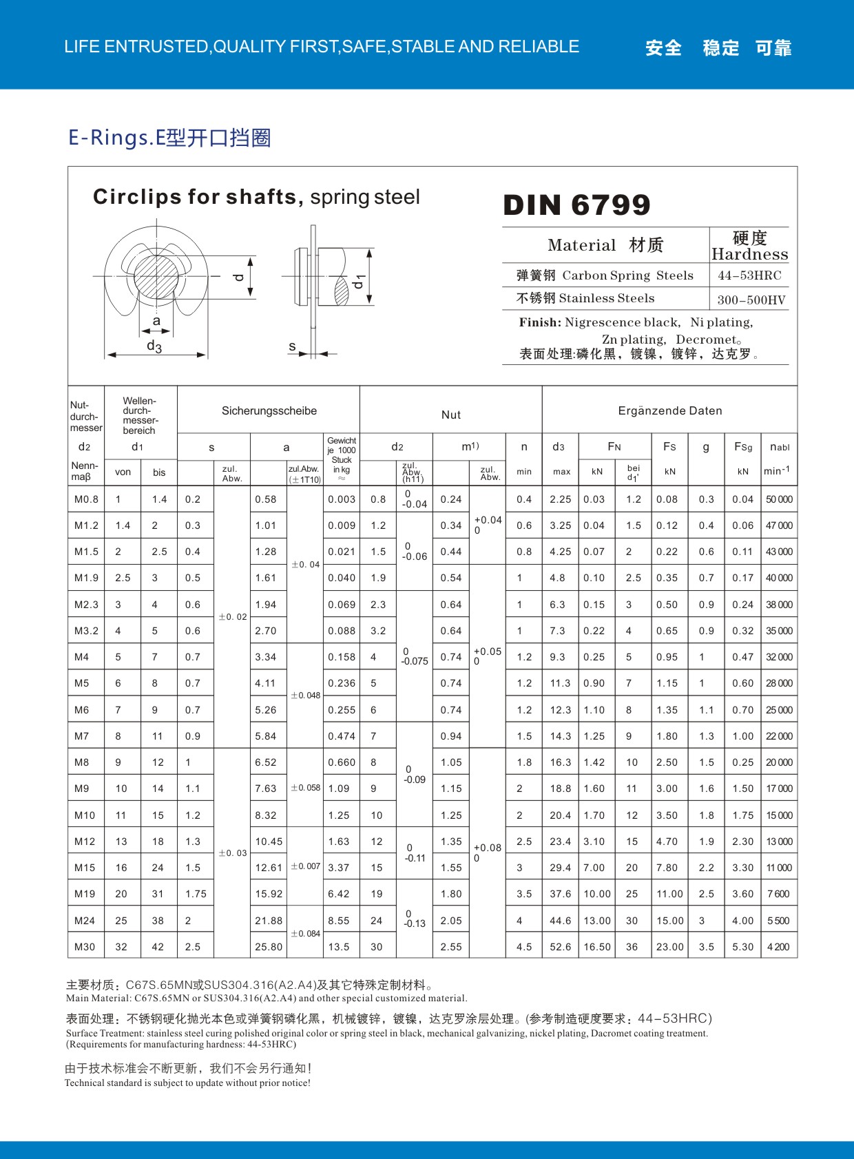 德國標(biāo)準(zhǔn)DIN6799開口擋圈,使用65MN,C67S彈簧鋼材質(zhì)及SUS304.SUS316/EN1.4301.EN1.4401不銹鋼材質(zhì),硬化質(zhì)量穩(wěn)定,回彈性好!彈簧鋼表面磷化黑,機(jī)械鋅等!鹽霧可達(dá)500H以上,保證無氫脆斷裂!瑞士模具制造設(shè)備,可生產(chǎn)0.8微精密開口擋圈,史特牢公司級進(jìn)模具生產(chǎn)高效率低成本!